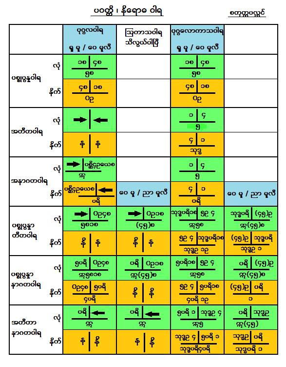 စတုတ္ထပလ္လင်ဖြစ်သောနိရောဓဝါရဇယားကို တင်ပေးလိုက်ပါသည်။ နိရောဓဝါရအတွက် သြကာသဝါရကိုနားလည်လွယ်ပြီဖြစ်၍ ထပ်မံရေးဆွဲထည့်သွင်း မထားပါ။ သင်္ကေတအနေနှင့်လည်း အပိုင်း(၃)တွင် ဖော်ပြထားပြီးဖြစ်ရာ